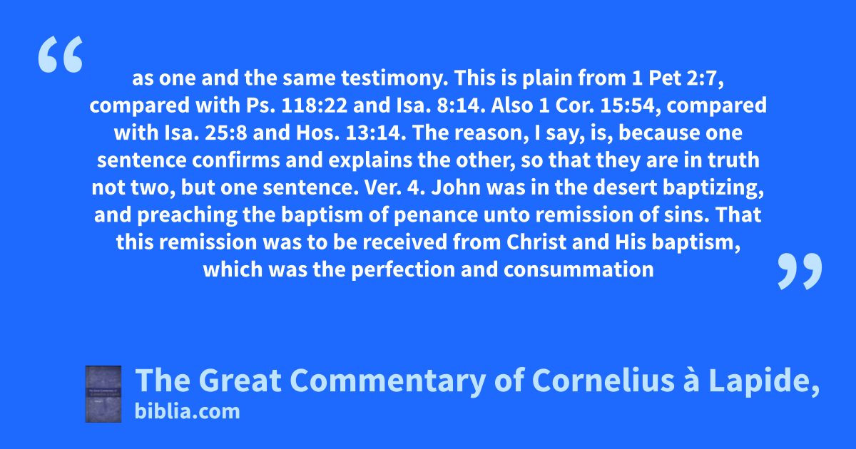 as one and the same testimony. This is plain from 1 Pet 2:7, compared with Ps. 118:22 and Isa. 8:14. Also 1 Cor. 15:54, compared with Isa. 25:8 and Hos. 13:14. The reason, I say, is, because one sentence confirms and explains the other, so that they are in truth not two, but one sentence. Ver. 4. John was in the desert baptizing, and preaching the baptism of penance unto remission of sins. That this remission was to be received from Christ and His baptism, which was the perfection and consummation