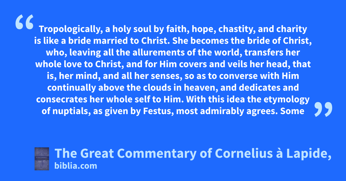 Tropologically, a holy soul by faith, hope, chastity, and charity is like a bride married to Christ. She becomes the bride of Christ, who, leaving all the allurements of the world, transfers her whole love to Christ, and for Him covers and veils her head, that is, her mind, and all her senses, so as to converse with Him continually above the clouds in heaven, and dedicates and consecrates her whole self to Him. With this idea the etymology of nuptials, as given by Festus, most admirably agrees. Some