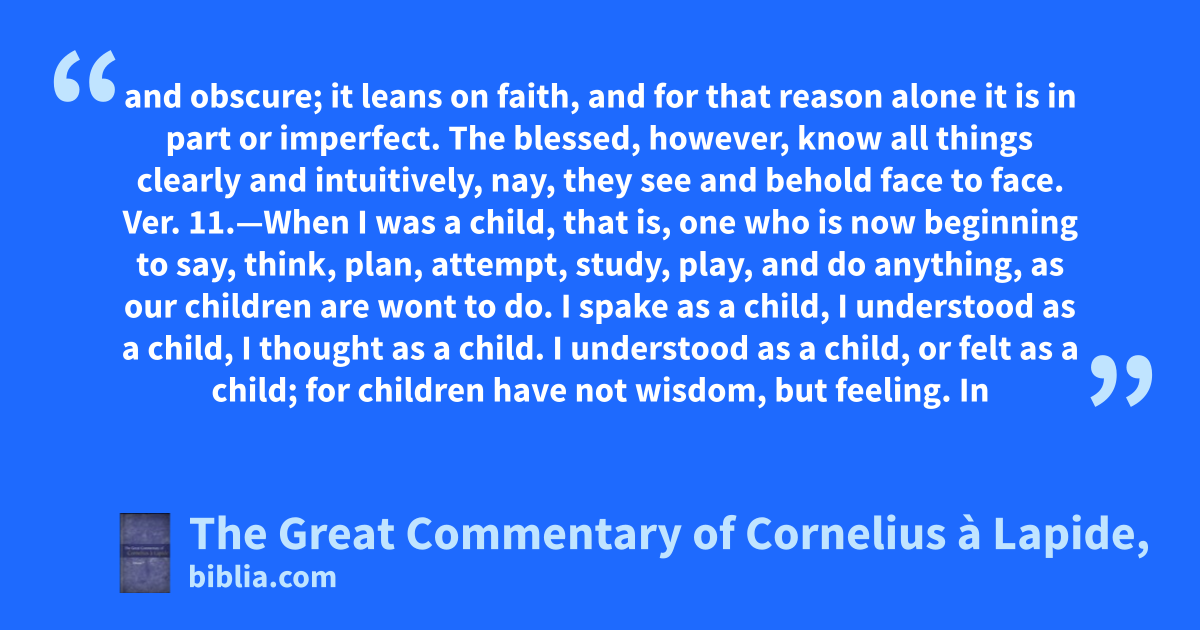 and obscure; it leans on faith, and for that reason alone it is in part or imperfect. The blessed, however, know all things clearly and intuitively, nay, they see and behold face to face. Ver. 11.—When I was a child, that is, one who is now beginning to say, think, plan, attempt, study, play, and do anything, as our children are wont to do. I spake as a child, I understood as a child, I thought as a child. I understood as a child, or felt as a child; for children have not wisdom, but feeling. In