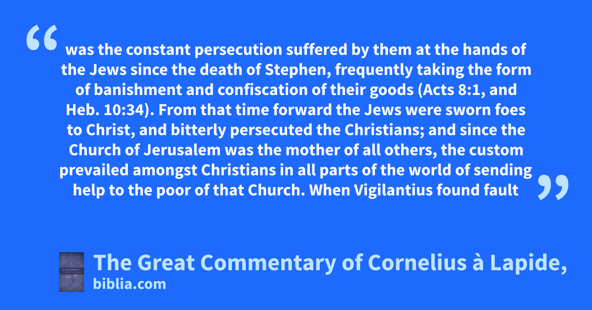 was the constant persecution suffered by them at the hands of the Jews since the death of Stephen, frequently taking the form of banishment and confiscation of their goods (Acts 8:1, and Heb. 10:34). From that time forward the Jews were sworn foes to Christ, and bitterly persecuted the Christians; and since the Church of Jerusalem was the mother of all others, the custom prevailed amongst Christians in all parts of the world of sending help to the poor of that Church. When Vigilantius found fault