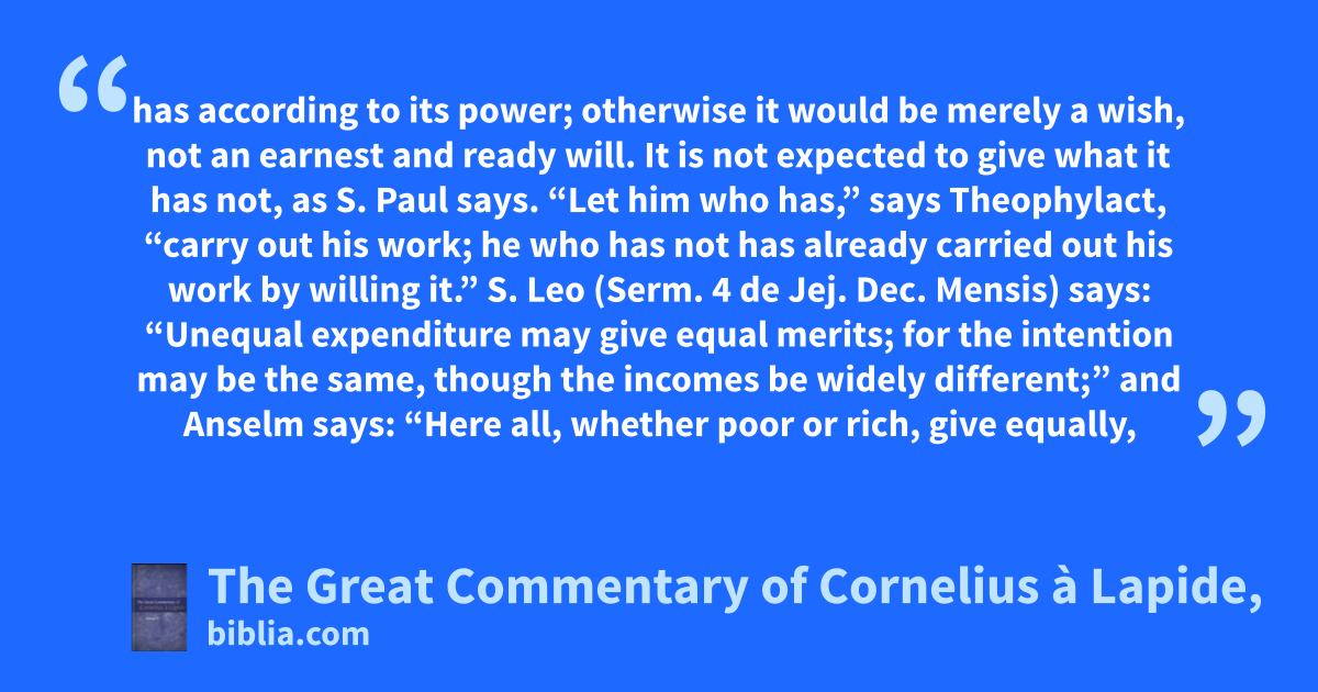 has according to its power; otherwise it would be merely a wish, not an earnest and ready will. It is not expected to give what it has not, as S. Paul says. “Let him who has,” says Theophylact, “carry out his work; he who has not has already carried out his work by willing it.” S. Leo (Serm. 4 de Jej. Dec. Mensis) says: “Unequal expenditure may give equal merits; for the intention may be the same, though the incomes be widely different;” and Anselm says: “Here all, whether poor or rich, give equally,