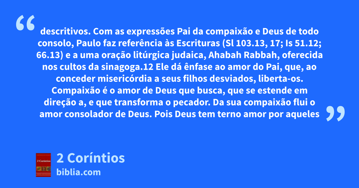 descritivos. Com as expressões Pai da compaixão e Deus de todo consolo, Paulo faz referência às Escrituras (Sl 103.13, 17; Is 51.12; 66.13) e a uma oração litúrgica judaica, Ahabah Rabbah, oferecida nos cultos da sinagoga.12 Ele dá ênfase ao amor do Pai, que, ao conceder misericórdia a seus filhos desviados, liberta-os. Compaixão é o amor de Deus que busca, que se estende em direção a, e que transforma o pecador. Da sua compaixão flui o amor consolador de Deus. Pois Deus tem terno amor por aqueles