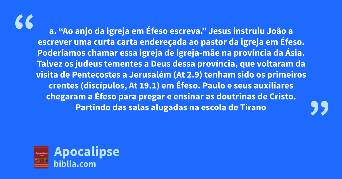 a. “Ao anjo da igreja em Éfeso escreva.” Jesus instruiu João a escrever uma curta carta endereçada ao pastor da igreja em Éfeso. Poderíamos chamar essa igreja de igreja-mãe na província da Ásia. Talvez os judeus tementes a Deus dessa província, que voltaram da visita de Pentecostes a Jerusalém (At 2.9) tenham sido os primeiros crentes (discípulos, At 19.1) em Éfeso. Paulo e seus auxiliares chegaram a Éfeso para pregar e ensinar as doutrinas de Cristo. Partindo das salas alugadas na escola de Tirano