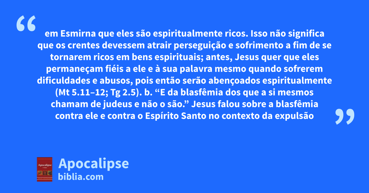 em Esmirna que eles são espiritualmente ricos. Isso não significa que os crentes devessem atrair perseguição e sofrimento a fim de se tornarem ricos em bens espirituais; antes, Jesus quer que eles permaneçam fiéis a ele e à sua palavra mesmo quando sofrerem dificuldades e abusos, pois então serão abençoados espiritualmente (Mt 5.11–12; Tg 2.5). b. “E da blasfêmia dos que a si mesmos chamam de judeus e não o são.” Jesus falou sobre a blasfêmia contra ele e contra o Espírito Santo no contexto da expulsão