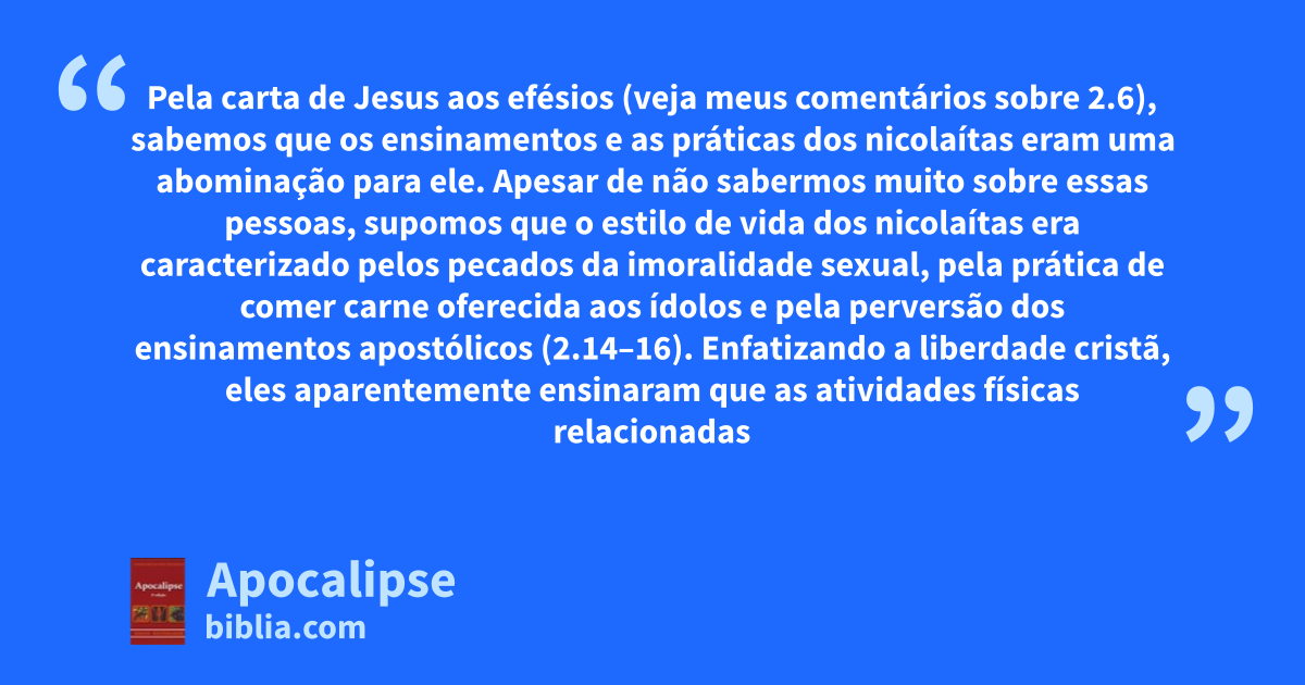 Pela carta de Jesus aos efésios (veja meus comentários sobre 2.6), sabemos que os ensinamentos e as práticas dos nicolaítas eram uma abominação para ele. Apesar de não sabermos muito sobre essas pessoas, supomos que o estilo de vida dos nicolaítas era caracterizado pelos pecados da imoralidade sexual, pela prática de comer carne oferecida aos ídolos e pela perversão dos ensinamentos apostólicos (2.14–16). Enfatizando a liberdade cristã, eles aparentemente ensinaram que as atividades físicas relacionadas