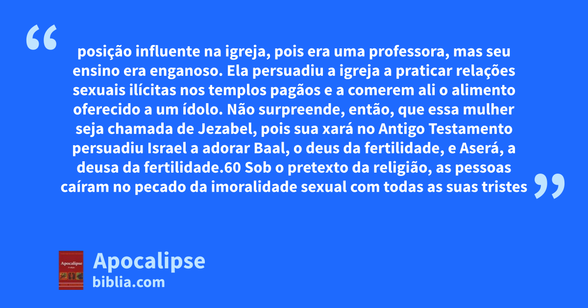 posição influente na igreja, pois era uma professora, mas seu ensino era enganoso. Ela persuadiu a igreja a praticar relações sexuais ilícitas nos templos pagãos e a comerem ali o alimento oferecido a um ídolo. Não surpreende, então, que essa mulher seja chamada de Jezabel, pois sua xará no Antigo Testamento persuadiu Israel a adorar Baal, o deus da fertilidade, e Aserá, a deusa da fertilidade.60 Sob o pretexto da religião, as pessoas caíram no pecado da imoralidade sexual com todas as suas tristes