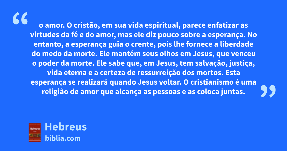 o amor. O cristão, em sua vida espiritual, parece enfatizar as virtudes da fé e do amor, mas ele diz pouco sobre a esperança. No entanto, a esperança guia o crente, pois lhe fornece a liberdade do medo da morte. Ele mantém seus olhos em Jesus, que venceu o poder da morte. Ele sabe que, em Jesus, tem salvação, justiça, vida eterna e a certeza de ressurreição dos mortos. Esta esperança se realizará quando Jesus voltar. O cristianismo é uma religião de amor que alcança as pessoas e as coloca juntas.