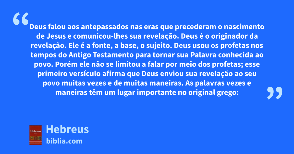 Deus falou aos antepassados nas eras que precederam o nascimento de Jesus e comunicou-lhes sua revelação. Deus é o originador da revelação. Ele é a fonte, a base, o sujeito. Deus usou os profetas nos tempos do Antigo Testamento para tornar sua Palavra conhecida ao povo. Porém ele não se limitou a falar por meio dos profetas; esse primeiro versículo afirma que Deus enviou sua revelação ao seu povo muitas vezes e de muitas maneiras. As palavras vezes e maneiras têm um lugar importante no original grego: