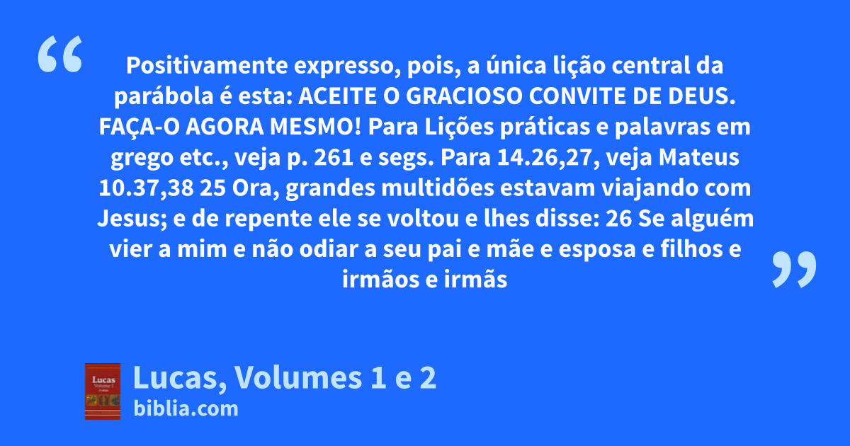 Positivamente expresso, pois, a única lição central da parábola é esta: ACEITE O GRACIOSO CONVITE DE DEUS. FAÇA-O AGORA MESMO! Para Lições práticas e palavras em grego etc., veja p. 261 e segs. Para 14.26,27, veja Mateus 10.37,38 25 Ora, grandes multidões estavam viajando com Jesus; e de repente ele se voltou e lhes disse: 26 Se alguém vier a mim e não odiar a seu pai e mãe e esposa e filhos e irmãos e irmãs