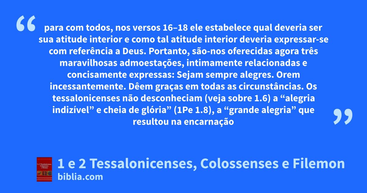 para com todos, nos versos 16–18 ele estabelece qual deveria ser sua atitude interior e como tal atitude interior deveria expressar-se com referência a Deus. Portanto, são-nos oferecidas agora três maravilhosas admoestações, intimamente relacionadas e concisamente expressas: Sejam sempre alegres. Orem incessantemente. Dêem graças em todas as circunstâncias. Os tessalonicenses não desconheciam (veja sobre 1.6) a “alegria indizível” e cheia de glória” (1Pe 1.8), a “grande alegria” que resultou na encarnação