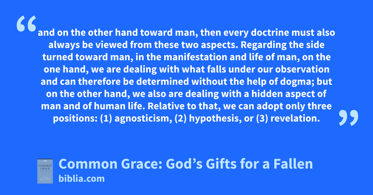 and on the other hand toward man, then every doctrine must also always be viewed from these two aspects. Regarding the side turned toward man, in the manifestation and life of man, on the one hand, we are dealing with what falls under our observation and can therefore be determined without the help of dogma; but on the other hand, we also are dealing with a hidden aspect of man and of human life. Relative to that, we can adopt only three positions: (1) agnosticism, (2) hypothesis, or (3) revelation.