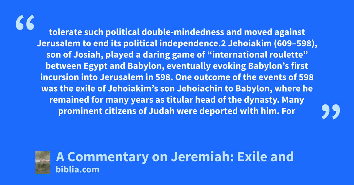 tolerate such political double-mindedness and moved against Jerusalem to end its political independence.2 Jehoiakim (609–598), son of Josiah, played a daring game of “international roulette” between Egypt and Babylon, eventually evoking Babylon’s first incursion into Jerusalem in 598. One outcome of the events of 598 was the exile of Jehoiakim’s son Jehoiachin to Babylon, where he remained for many years as titular head of the dynasty. Many prominent citizens of Judah were deported with him. For