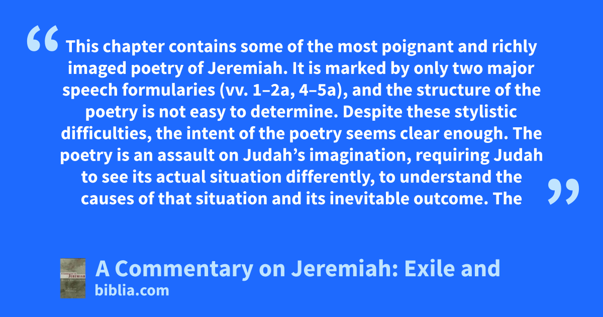 This chapter contains some of the most poignant and richly imaged poetry of Jeremiah. It is marked by only two major speech formularies (vv. 1–2a, 4–5a), and the structure of the poetry is not easy to determine. Despite these stylistic difficulties, the intent of the poetry seems clear enough. The poetry is an assault on Judah’s imagination, requiring Judah to see its actual situation differently, to understand the causes of that situation and its inevitable outcome. The
