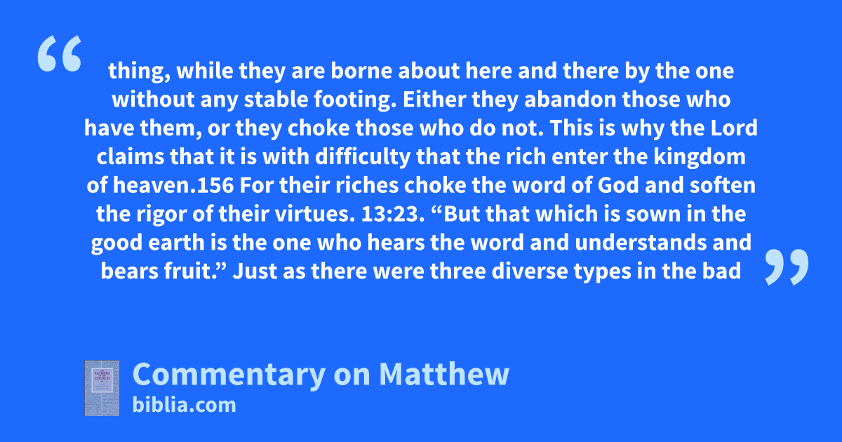 thing, while they are borne about here and there by the one without any stable footing. Either they abandon those who have them, or they choke those who do not. This is why the Lord claims that it is with difficulty that the rich enter the kingdom of heaven.156 For their riches choke the word of God and soften the rigor of their virtues. 13:23. “But that which is sown in the good earth is the one who hears the word and understands and bears fruit.” Just as there were three diverse types in the bad