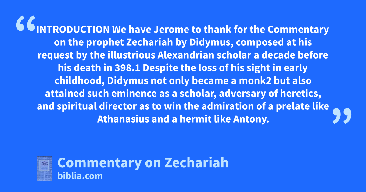 The book of Zechariah is “the longest and most obscure” of the Twelve Minor Prophets, Jerome remarked. That may have been the reason why in 386 he visited the Alexandrian scholar Didymus the Blind and requested a work on this prophet. Though long thought to be lost, the work was rediscovered in 1941 at Tura outside Cairo along with some other biblical commentaries. As a result we have in our...