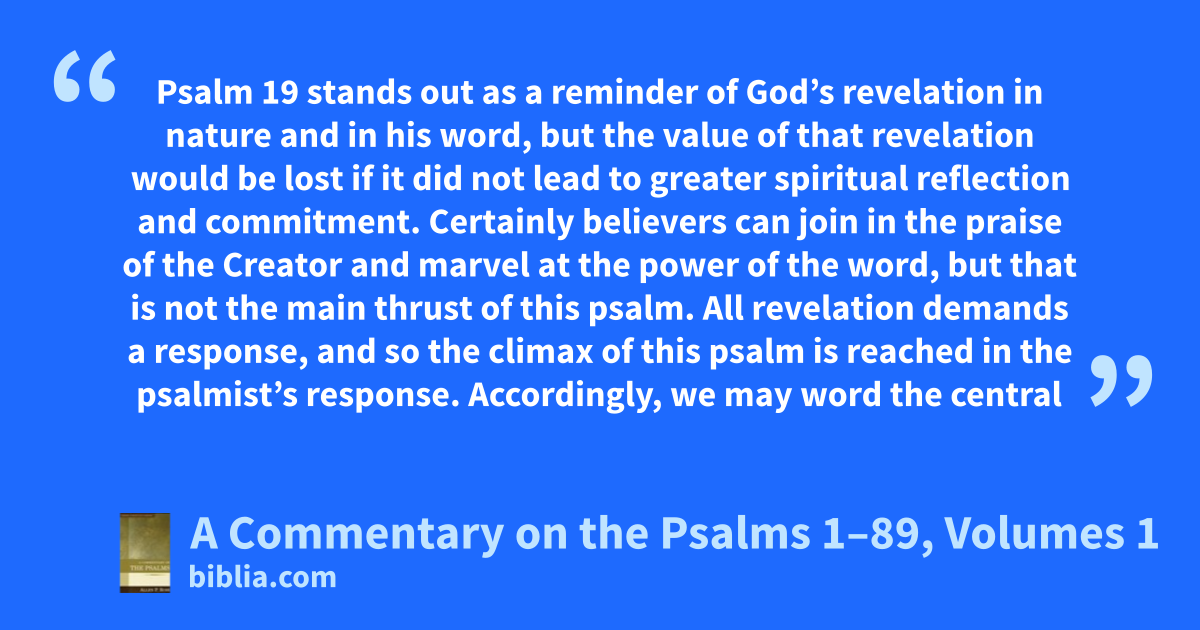 Psalm 19 stands out as a reminder of God’s revelation in nature and in his word, but the value of that revelation would be lost if it did not lead to greater spiritual reflection and commitment. Certainly believers can join in the praise of the Creator and marvel at the power of the word, but that is not the main thrust of this psalm. All revelation demands a response, and so the climax of this psalm is reached in the psalmist’s response. Accordingly, we may word the central