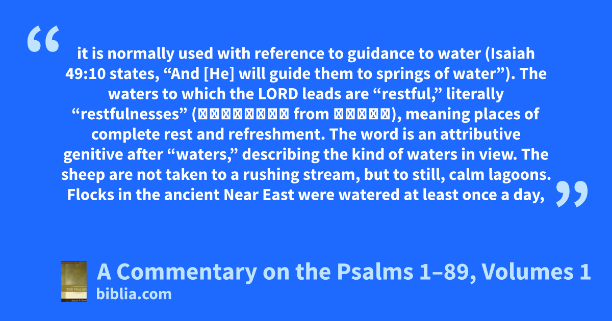 it is normally used with reference to guidance to water (Isaiah 49:10 states, “And [He] will guide them to springs of water”). The waters to which the LORD leads are “restful,” literally “restfulnesses” (מְנֻחוֹת from נוּחַ), meaning places of complete rest and refreshment. The word is an attributive genitive after “waters,” describing the kind of waters in view. The sheep are not taken to a rushing stream, but to still, calm lagoons. Flocks in the ancient Near East were watered at least once a day,