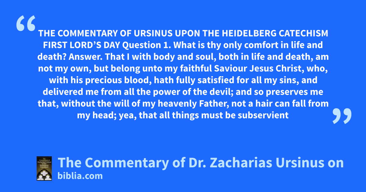 THE COMMENTARY OF URSINUS UPON THE HEIDELBERG CATECHISM FIRST LORD’S DAY Question 1. What is thy only comfort in life and death? Answer. That I with body and soul, both in life and death, am not my own, but belong unto my faithful Saviour Jesus Christ, who, with his precious blood, hath fully satisfied for all my sins, and delivered me from all the power of the devil; and so preserves me that, without the will of my heavenly Father, not a hair can fall from my head; yea, that all things must be subservient
