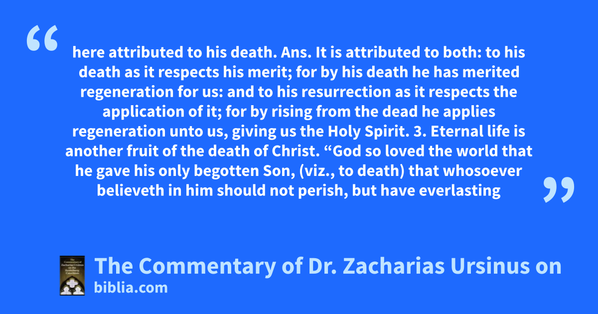 here attributed to his death. Ans. It is attributed to both: to his death as it respects his merit; for by his death he has merited regeneration for us: and to his resurrection as it respects the application of it; for by rising from the dead he applies regeneration unto us, giving us the Holy Spirit. 3. Eternal life is another fruit of the death of Christ. “God so loved the world that he gave his only begotten Son, (viz., to death) that whosoever believeth in him should not perish, but have everlasting