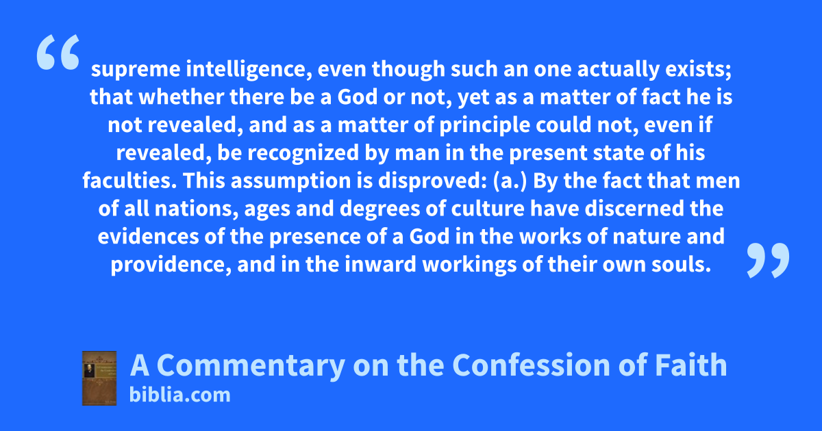 supreme intelligence, even though such an one actually exists; that whether there be a God or not, yet as a matter of fact he is not revealed, and as a matter of principle could not, even if revealed, be recognized by man in the present state of his faculties. This assumption is disproved: (a.) By the fact that men of all nations, ages and degrees of culture have discerned the evidences of the presence of a God in the works of nature and providence, and in the inward workings of their own souls.