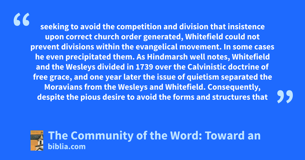 seeking to avoid the competition and division that insistence upon correct church order generated, Whitefield could not prevent divisions within the evangelical movement. In some cases he even precipitated them. As Hindmarsh well notes, Whitefield and the Wesleys divided in 1739 over the Calvinistic doctrine of free grace, and one year later the issue of quietism separated the Moravians from the Wesleys and Whitefield. Consequently, despite the pious desire to avoid the forms and structures that