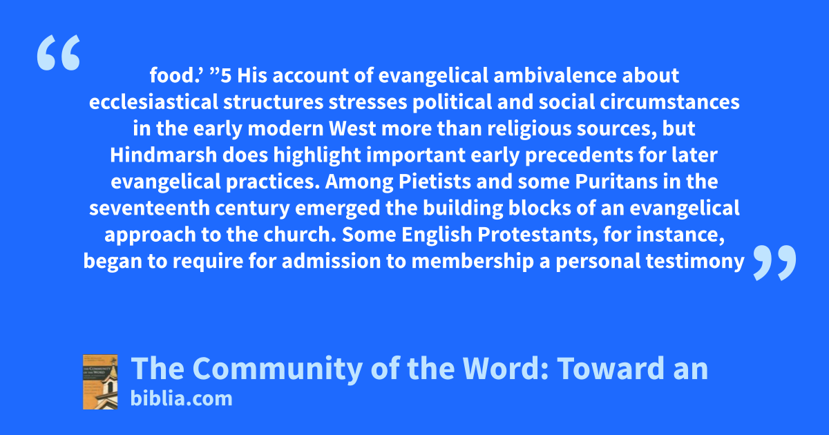 food.’ ”5 His account of evangelical ambivalence about ecclesiastical structures stresses political and social circumstances in the early modern West more than religious sources, but Hindmarsh does highlight important early precedents for later evangelical practices. Among Pietists and some Puritans in the seventeenth century emerged the building blocks of an evangelical approach to the church. Some English Protestants, for instance, began to require for admission to membership a personal testimony