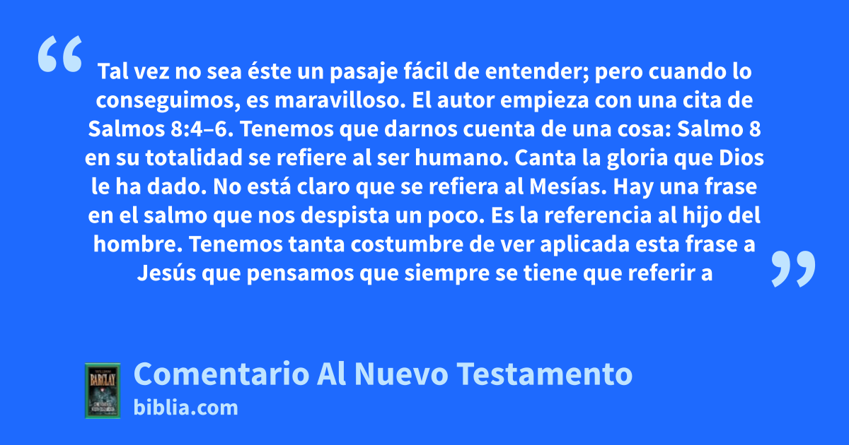 Tal vez no sea éste un pasaje fácil de entender; pero cuando lo conseguimos, es maravilloso. El autor empieza con una cita de Salmos 8:4–6. Tenemos que darnos cuenta de una cosa: Salmo 8 en su totalidad se refiere al ser humano. Canta la gloria que Dios le ha dado. No está claro que se refiera al Mesías. Hay una frase en el salmo que nos despista un poco. Es la referencia al hijo del hombre. Tenemos tanta costumbre de ver aplicada esta frase a Jesús que pensamos que siempre se tiene que referir a