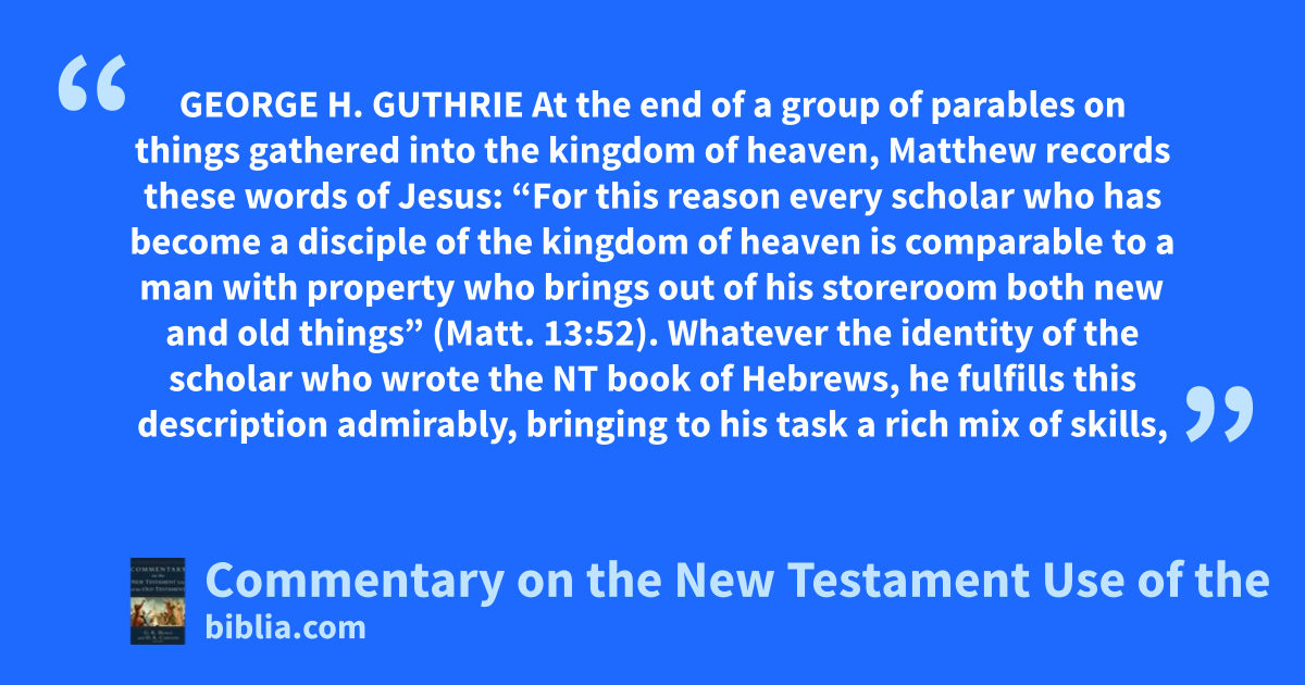 GEORGE H. GUTHRIE At the end of a group of parables on things gathered into the kingdom of heaven, Matthew records these words of Jesus: “For this reason every scholar who has become a disciple of the kingdom of heaven is comparable to a man with property who brings out of his storeroom both new and old things” (Matt. 13:52). Whatever the identity of the scholar who wrote the NT book of Hebrews, he fulfills this description admirably, bringing to his task a rich mix of skills,