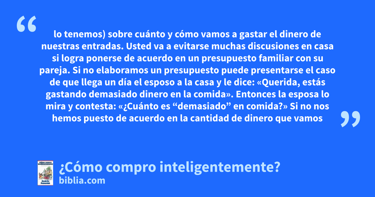 lo tenemos) sobre cuánto y cómo vamos a gastar el dinero de nuestras entradas. Usted va a evitarse muchas discusiones en casa si logra ponerse de acuerdo en un presupuesto familiar con su pareja. Si no elaboramos un presupuesto puede presentarse el caso de que llega un día el esposo a la casa y le dice: «Querida, estás gastando demasiado dinero en la comida». Entonces la esposa lo mira y contesta: «¿Cuánto es “demasiado” en comida?» Si no nos hemos puesto de acuerdo en la cantidad de dinero que vamos