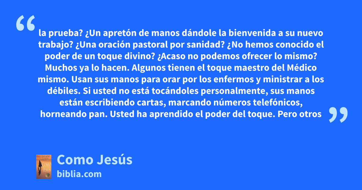 la prueba? ¿Un apretón de manos dándole la bienvenida a su nuevo trabajo? ¿Una oración pastoral por sanidad? ¿No hemos conocido el poder de un toque divino? ¿Acaso no podemos ofrecer lo mismo? Muchos ya lo hacen. Algunos tienen el toque maestro del Médico mismo. Usan sus manos para orar por los enfermos y ministrar a los débiles. Si usted no está tocándoles personalmente, sus manos están escribiendo cartas, marcando números telefónicos, horneando pan. Usted ha aprendido el poder del toque. Pero otros