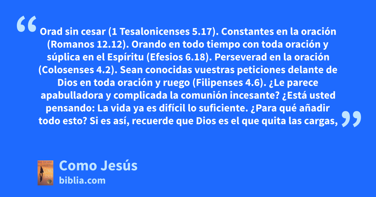 Orad sin cesar (1 Tesalonicenses 5.17). Constantes en la oración (Romanos 12.12). Orando en todo tiempo con toda oración y súplica en el Espíritu (Efesios 6.18). Perseverad en la oración (Colosenses 4.2). Sean conocidas vuestras peticiones delante de Dios en toda oración y ruego (Filipenses 4.6). ¿Le parece apabulladora y complicada la comunión incesante? ¿Está usted pensando: La vida ya es difícil lo suficiente. ¿Para qué añadir todo esto? Si es así, recuerde que Dios es el que quita las cargas,