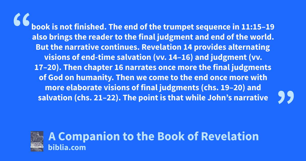 book is not finished. The end of the trumpet sequence in 11:15–19 also brings the reader to the final judgment and end of the world. But the narrative continues. Revelation 14 provides alternating visions of end-time salvation (vv. 14–16) and judgment (vv. 17–20). Then chapter 16 narrates once more the final judgments of God on humanity. Then we come to the end once more with more elaborate visions of final judgments (chs. 19–20) and salvation (chs. 21–22). The point is that while John’s narrative