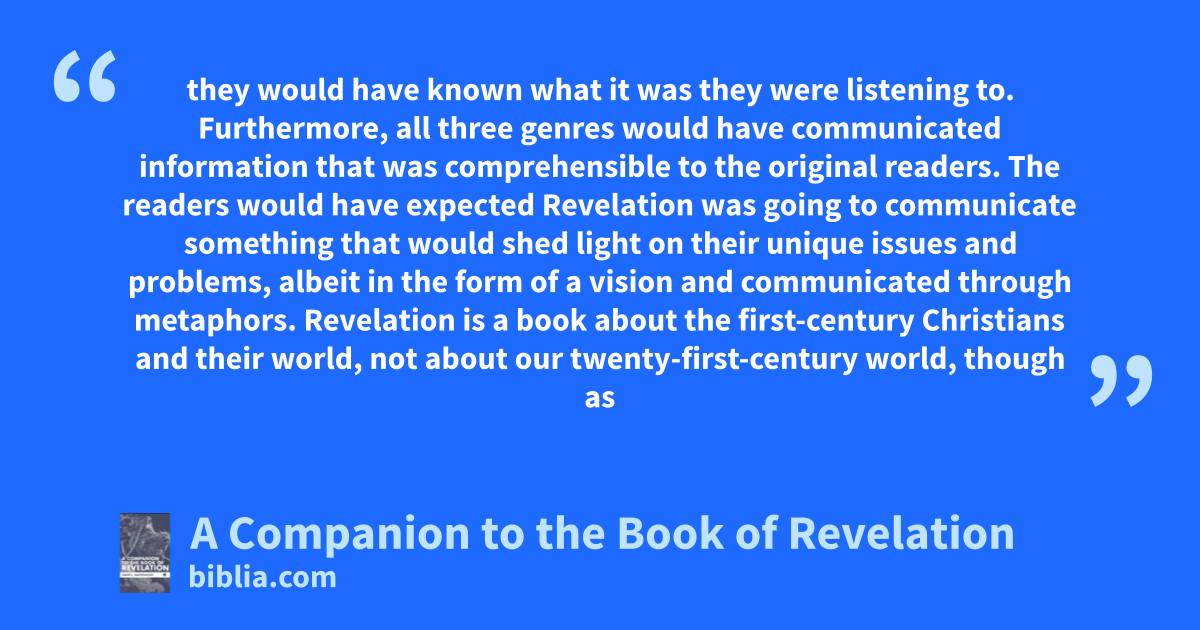 they would have known what it was they were listening to. Furthermore, all three genres would have communicated information that was comprehensible to the original readers. The readers would have expected Revelation was going to communicate something that would shed light on their unique issues and problems, albeit in the form of a vision and communicated through metaphors. Revelation is a book about the first-century Christians and their world, not about our twenty-first-century world, though as