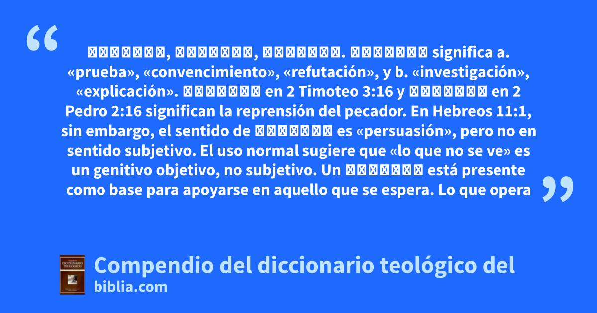 ἔλεγχος, ἔλεγξις, ἐλεγμός. ἔλενχος significa a. «prueba», «convencimiento», «refutación», y b. «investigación», «explicación». ἐλεγμός en 2 Timoteo 3:16 y ἔλεγξις en 2 Pedro 2:16 significan la reprensión del pecador. En Hebreos 11:1, sin embargo, el sentido de ἔλεγχος es «persuasión», pero no en sentido subjetivo. El uso normal sugiere que «lo que no se ve» es un genitivo objetivo, no subjetivo. Un ἔλεγχος está presente como base para apoyarse en aquello que se espera. Lo que opera
