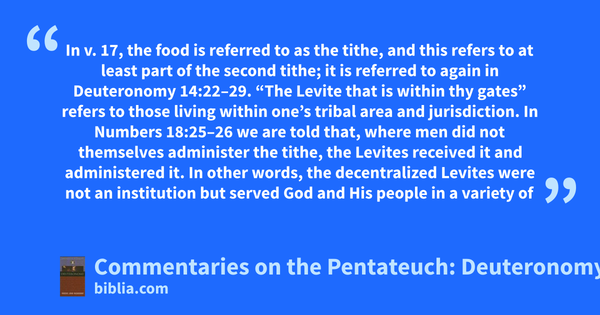In v. 17, the food is referred to as the tithe, and this refers to at least part of the second tithe; it is referred to again in Deuteronomy 14:22–29. “The Levite that is within thy gates” refers to those living within one’s tribal area and jurisdiction. In Numbers 18:25–26 we are told that, where men did not themselves administer the tithe, the Levites received it and administered it. In other words, the decentralized Levites were not an institution but served God and His people in a variety of