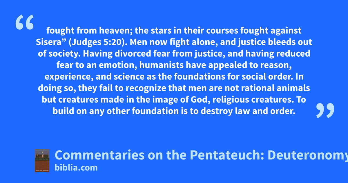 fought from heaven; the stars in their courses fought against Sisera” (Judges 5:20). Men now fight alone, and justice bleeds out of society. Having divorced fear from justice, and having reduced fear to an emotion, humanists have appealed to reason, experience, and science as the foundations for social order. In doing so, they fail to recognize that men are not rational animals but creatures made in the image of God, religious creatures. To build on any other foundation is to destroy law and order.