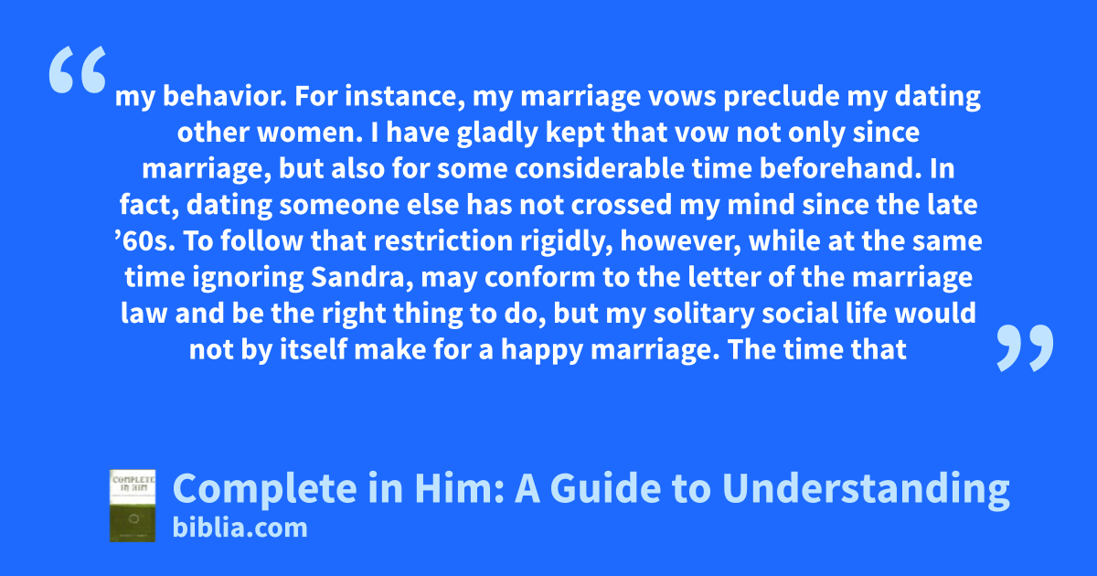 my behavior. For instance, my marriage vows preclude my dating other women. I have gladly kept that vow not only since marriage, but also for some considerable time beforehand. In fact, dating someone else has not crossed my mind since the late ’60s. To follow that restriction rigidly, however, while at the same time ignoring Sandra, may conform to the letter of the marriage law and be the right thing to do, but my solitary social life would not by itself make for a happy marriage. The time that