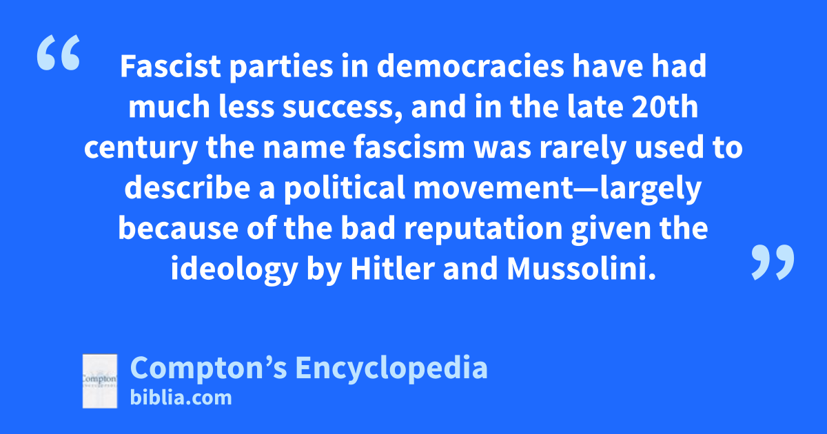 Fascist parties in democracies have had much less success, and in the late 20th century the name fascism was rarely used to describe a political movement—largely because of the bad reputation given the ideology by Hitler and Mussolini.