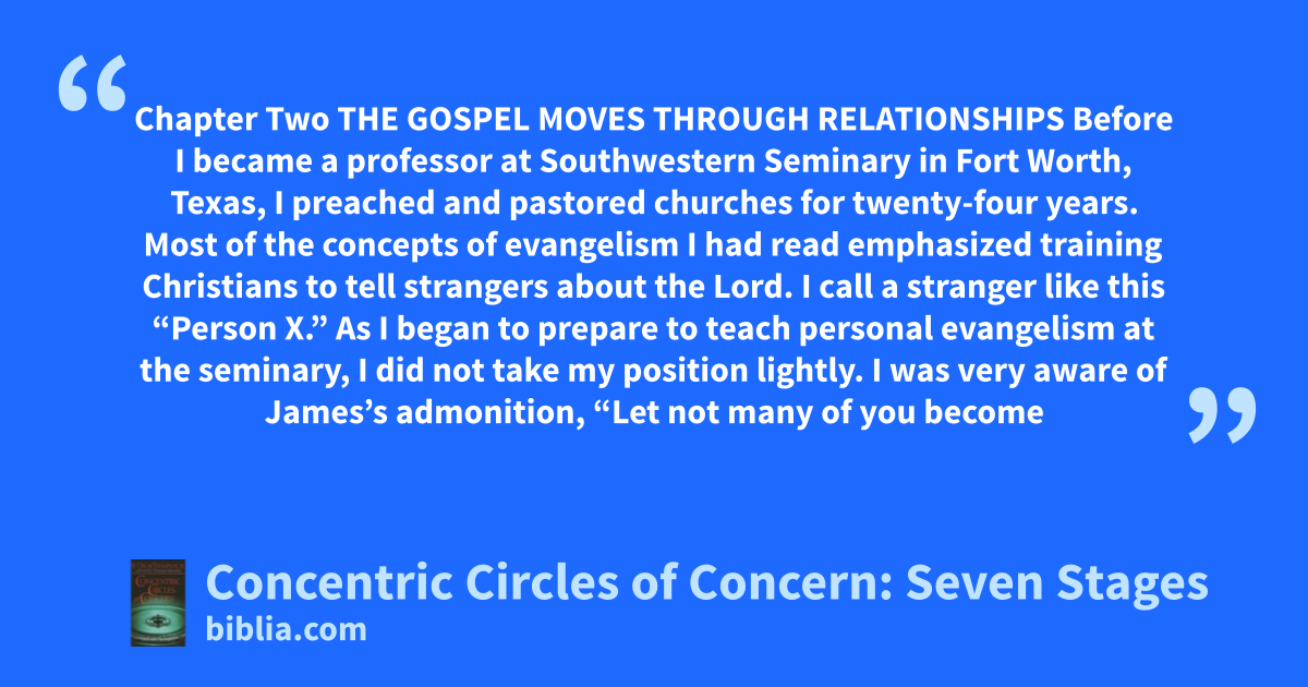 Chapter Two THE GOSPEL MOVES THROUGH RELATIONSHIPS Before I became a professor at Southwestern Seminary in Fort Worth, Texas, I preached and pastored churches for twenty-four years. Most of the concepts of evangelism I had read emphasized training Christians to tell strangers about the Lord. I call a stranger like this “Person X.” As I began to prepare to teach personal evangelism at the seminary, I did not take my position lightly. I was very aware of James’s admonition, “Let not many of you become