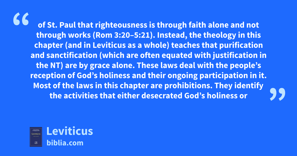of St. Paul that righteousness is through faith alone and not through works (Rom 3:20–5:21). Instead, the theology in this chapter (and in Leviticus as a whole) teaches that purification and sanctification (which are often equated with justification in the NT) are by grace alone. These laws deal with the people’s reception of God’s holiness and their ongoing participation in it. Most of the laws in this chapter are prohibitions. They identify the activities that either desecrated God’s holiness or