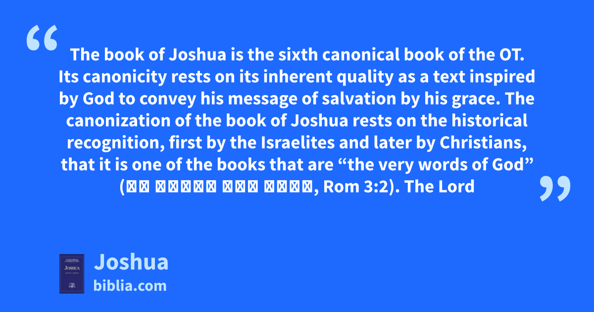 The book of Joshua is the sixth canonical book of the OT. Its canonicity rests on its inherent quality as a text inspired by God to convey his message of salvation by his grace. The canonization of the book of Joshua rests on the historical recognition, first by the Israelites and later by Christians, that it is one of the books that are “the very words of God” (τὰ λόγια τοῦ θεοῦ, Rom 3:2). The Lord