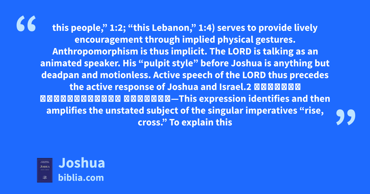 this people,” 1:2; “this Lebanon,” 1:4) serves to provide lively encouragement through implied physical gestures. Anthropomorphism is thus implicit. The LORD is talking as an animated speaker. His “pulpit style” before Joshua is anything but deadpan and motionless. Active speech of the LORD thus precedes the active response of Joshua and Israel.2 אַתָּה֙ וְכָל־הָעָ֣ם הַזֶּ֔ה—This expression identifies and then amplifies the unstated subject of the singular imperatives “rise, cross.” To explain this