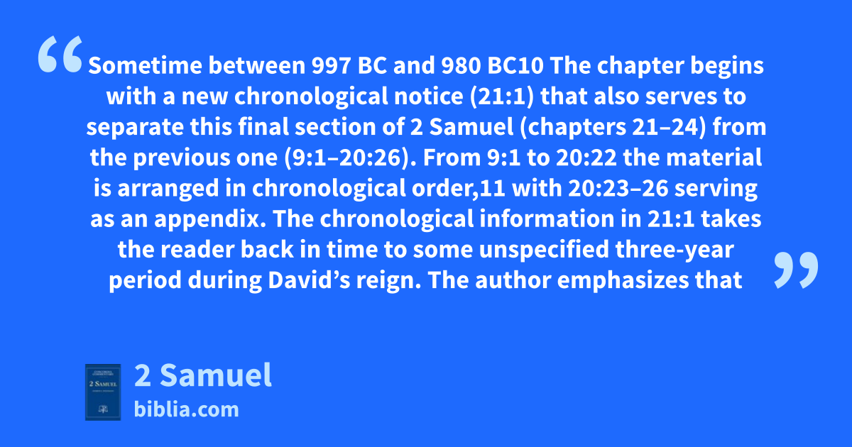 Sometime between 997 BC and 980 BC10 The chapter begins with a new chronological notice (21:1) that also serves to separate this final section of 2 Samuel (chapters 21–24) from the previous one (9:1–20:26). From 9:1 to 20:22 the material is arranged in chronological order,11 with 20:23–26 serving as an appendix. The chronological information in 21:1 takes the reader back in time to some unspecified three-year period during David’s reign. The author emphasizes that
