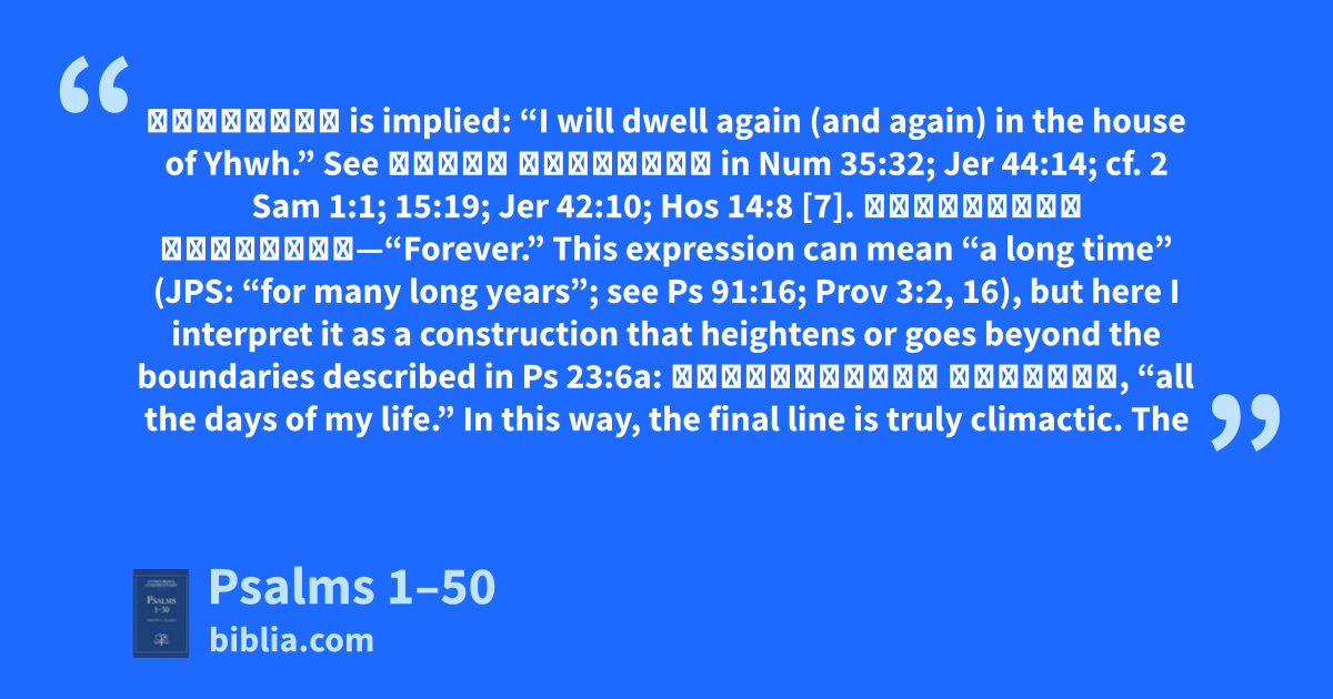 לָשֶׁבֶת is implied: “I will dwell again (and again) in the house of Yhwh.” See שׁוּב לָשֶׁבֶת in Num 35:32; Jer 44:14; cf. 2 Sam 1:1; 15:19; Jer 42:10; Hos 14:8 [7]. לְאֹ֣רֶךְ יָמִֽים׃—“Forever.” This expression can mean “a long time” (JPS: “for many long years”; see Ps 91:16; Prov 3:2, 16), but here I interpret it as a construction that heightens or goes beyond the boundaries described in Ps 23:6a: כָּל־יְמֵ֣י חַיָּ֑י, “all the days of my life.” In this way, the final line is truly climactic. The