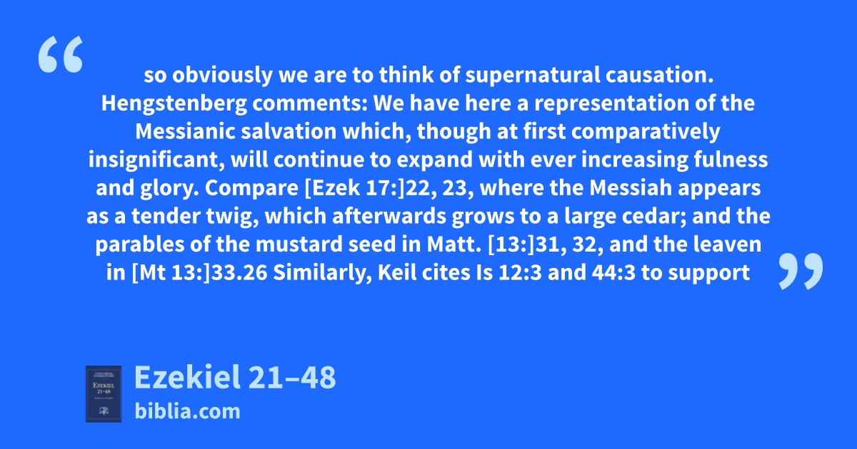 so obviously we are to think of supernatural causation. Hengstenberg comments: We have here a representation of the Messianic salvation which, though at first comparatively insignificant, will continue to expand with ever increasing fulness and glory. Compare [Ezek 17:]22, 23, where the Messiah appears as a tender twig, which afterwards grows to a large cedar; and the parables of the mustard seed in Matt. [13:]31, 32, and the leaven in [Mt 13:]33.26 Similarly, Keil cites Is 12:3 and 44:3 to support