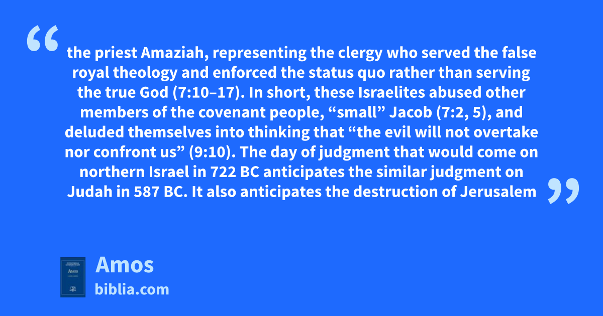 the priest Amaziah, representing the clergy who served the false royal theology and enforced the status quo rather than serving the true God (7:10–17). In short, these Israelites abused other members of the covenant people, “small” Jacob (7:2, 5), and deluded themselves into thinking that “the evil will not overtake nor confront us” (9:10). The day of judgment that would come on northern Israel in 722 BC anticipates the similar judgment on Judah in 587 BC. It also anticipates the destruction of Jerusalem