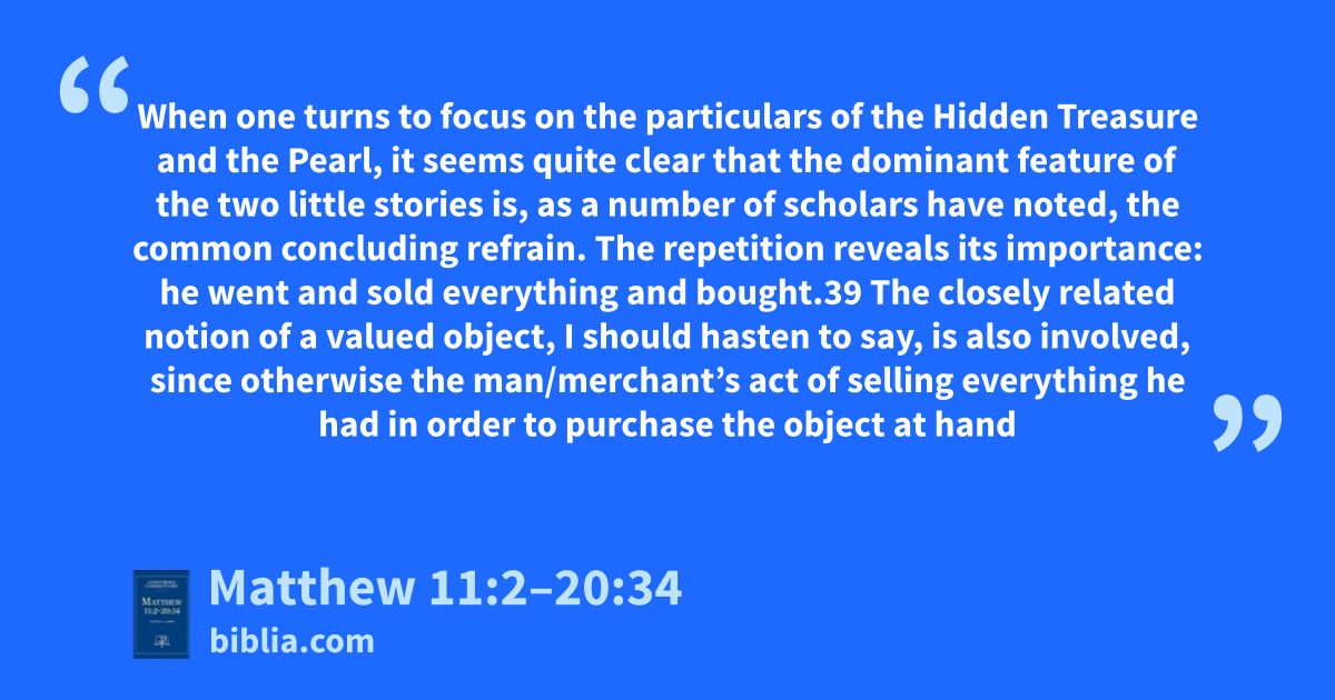 When one turns to focus on the particulars of the Hidden Treasure and the Pearl, it seems quite clear that the dominant feature of the two little stories is, as a number of scholars have noted, the common concluding refrain. The repetition reveals its importance: he went and sold everything and bought.39 The closely related notion of a valued object, I should hasten to say, is also involved, since otherwise the man/merchant’s act of selling everything he had in order to purchase the object at hand