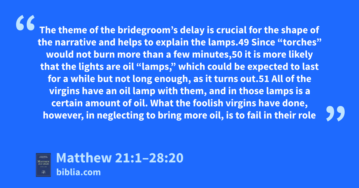 The theme of the bridegroom’s delay is crucial for the shape of the narrative and helps to explain the lamps.49 Since “torches” would not burn more than a few minutes,50 it is more likely that the lights are oil “lamps,” which could be expected to last for a while but not long enough, as it turns out.51 All of the virgins have an oil lamp with them, and in those lamps is a certain amount of oil. What the foolish virgins have done, however, in neglecting to bring more oil, is to fail in their role