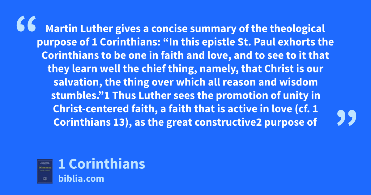Martin Luther gives a concise summary of the theological purpose of 1 Corinthians: “In this epistle St. Paul exhorts the Corinthians to be one in faith and love, and to see to it that they learn well the chief thing, namely, that Christ is our salvation, the thing over which all reason and wisdom stumbles.”1 Thus Luther sees the promotion of unity in Christ-centered faith, a faith that is active in love (cf. 1 Corinthians 13), as the great constructive2 purpose of