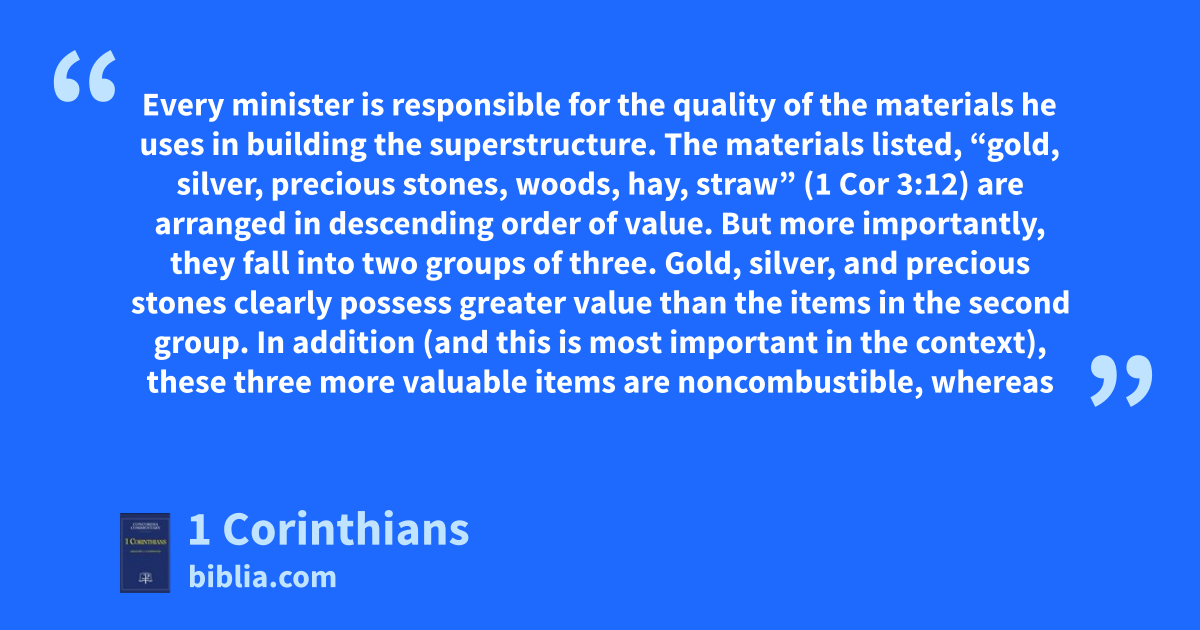 Every minister is responsible for the quality of the materials he uses in building the superstructure. The materials listed, “gold, silver, precious stones, woods, hay, straw” (1 Cor 3:12) are arranged in descending order of value. But more importantly, they fall into two groups of three. Gold, silver, and precious stones clearly possess greater value than the items in the second group. In addition (and this is most important in the context), these three more valuable items are noncombustible, whereas